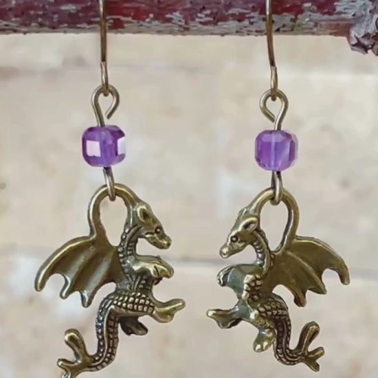 Amethyst Dragon Earrings – Antique Bronze Dragon Charms, Fantasy Jewelry, D&D Accessories, RPG Earrings, Magical Gift for Dragon Lovers