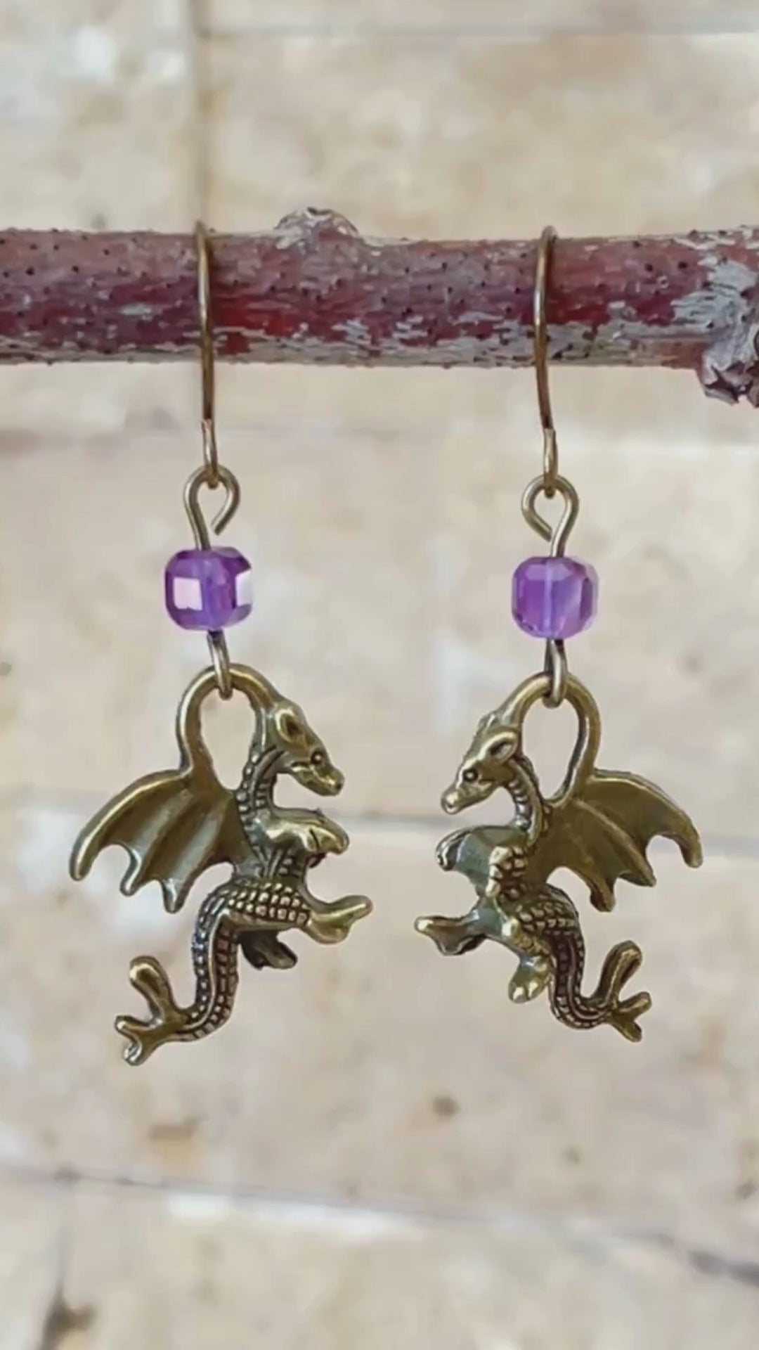 The detailed bronze dragon charms evoke fire, strength, and protection, while the rich amethyst beads add a mystical glow long associated with wisdom, magic, and arcane energy. Together, they create bold fantasy dragon earrings perfect for spellcasters, adventurers, and lore lovers alike.
