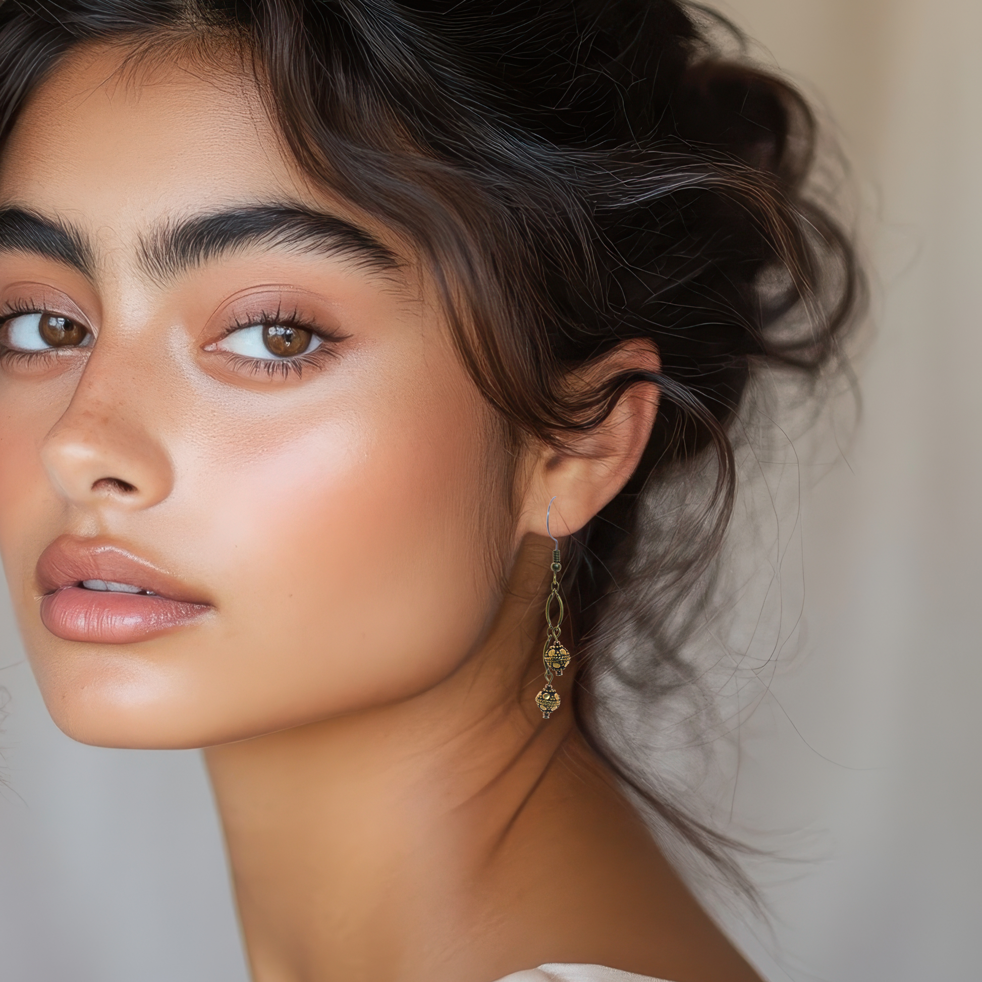 The warm antique bronze finish paired with the unique curved chain design creates a striking silhouette perfect for boho chic outfits, festival wear, and alternative fashion. The decorative metal beads add a touch of artisanal detail, giving these earrings a handcrafted, free-spirited vibe.