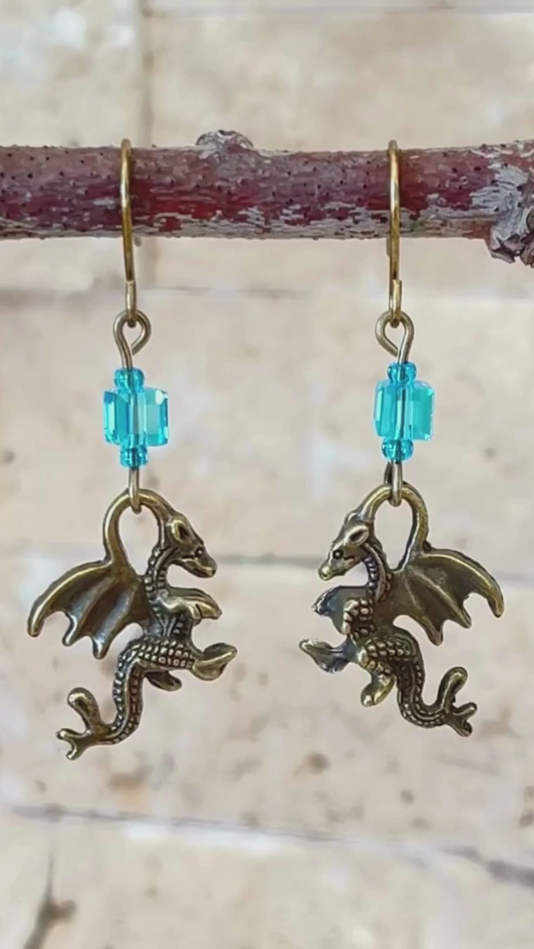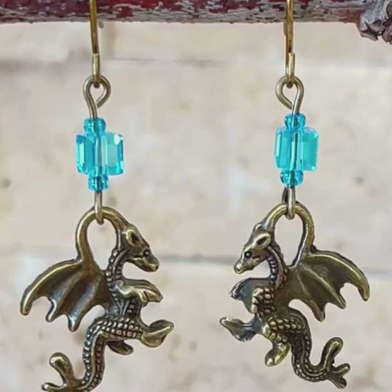 Channel ancient magic and legendary power with these striking earrings featuring Austrian crystal blue faceted cube beads paired with antique bronze dragon charms. Designed for fans of fantasy worlds, Dungeons & Dragons, role-playing games, Lord of the Rings, The Hobbit, Harry Potter, and iconic dragons like Smaug, this pair captures the mystery and strength of epic lore.