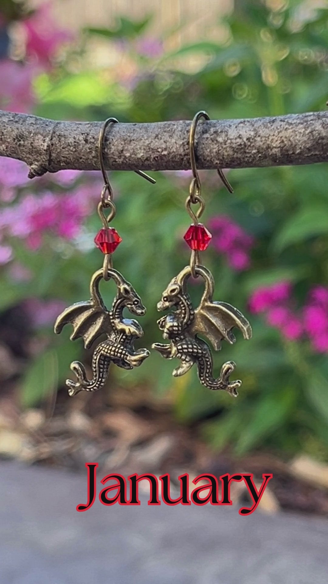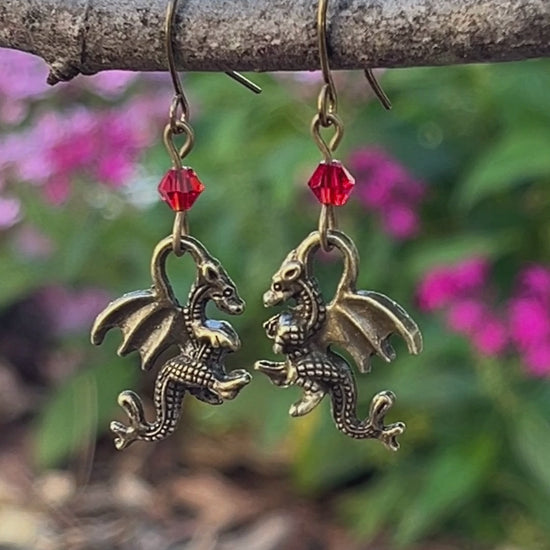 Dragon Birthstone Earrings – Austrian Crystal Fantasy Jewelry in Antique Bronze