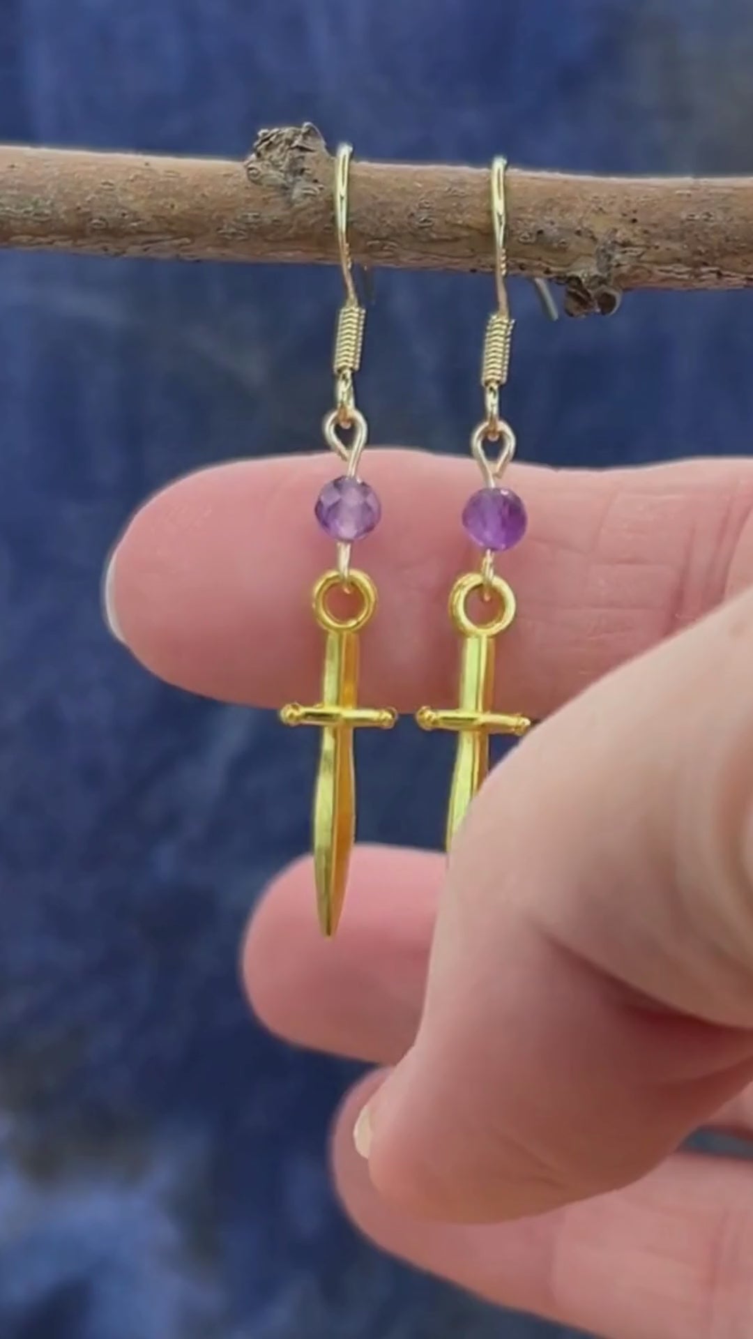 Gold Sword Earrings with Amethyst