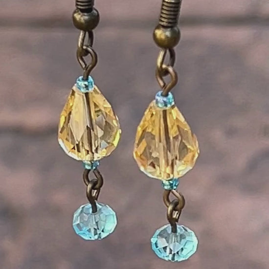 Shimmer with color and elegance in these stunning earrings featuring 10mm teardrop golden champagne crystals, sparkling 6mm aqua blue rondelle crystals, and vibrant Caribbean blue seed beads. Designed for lovers of boho crystal jewelry, beach-inspired accessories, and handmade dangle earrings, this pair brings warmth, sparkle, and tropical charm to any outfit.