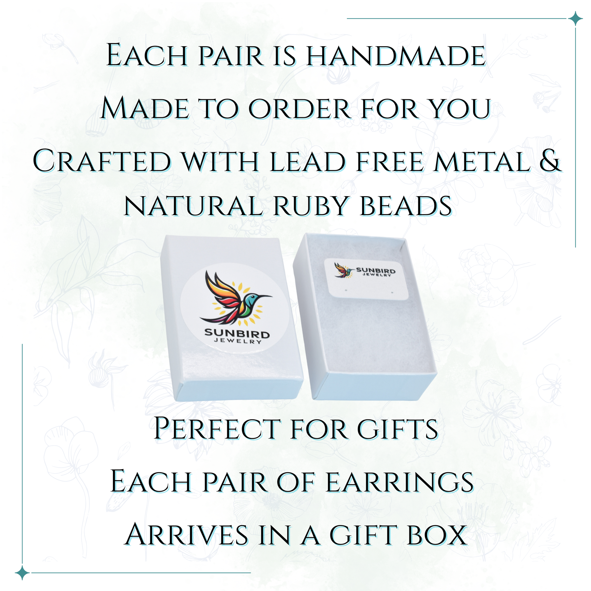 These ruby earrings are ideal as a July birthday gift for her, a meaningful birthstone gift, or a striking accessory for anyone drawn to vintage-inspired, nature-themed jewelry. The faceted ruby coin beads catch the light beautifully, giving these boho floral earrings a radiant sparkle while maintaining a timeless, earthy charm.