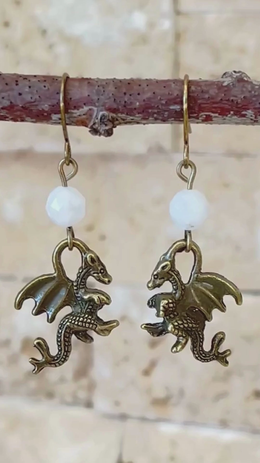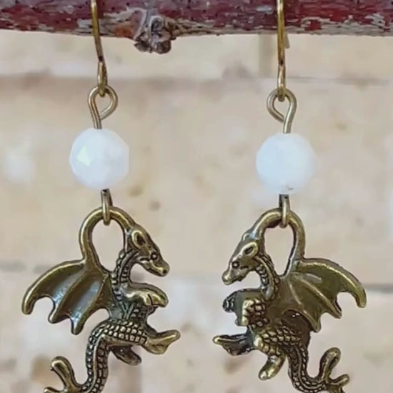 Moonstone Dragon Earrings – Antique Bronze Dragon Charms, Fantasy Jewelry, D&D Accessories, RPG Earrings
