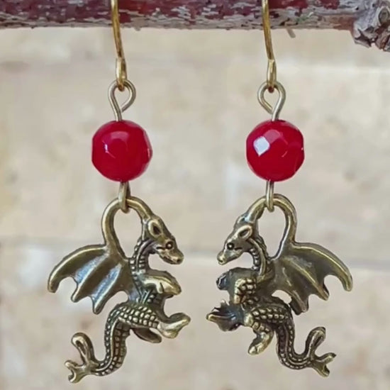 Embrace fiery strength and ancient magic with these striking earrings featuring rich red jade beads and antique bronze dragon charms. Designed for fans of fantasy worlds, Dungeons & Dragons, role-playing games, Lord of the Rings, The Hobbit, Harry Potter, and legendary dragons like Smaug, this pair channels the power and mystery of epic lore.