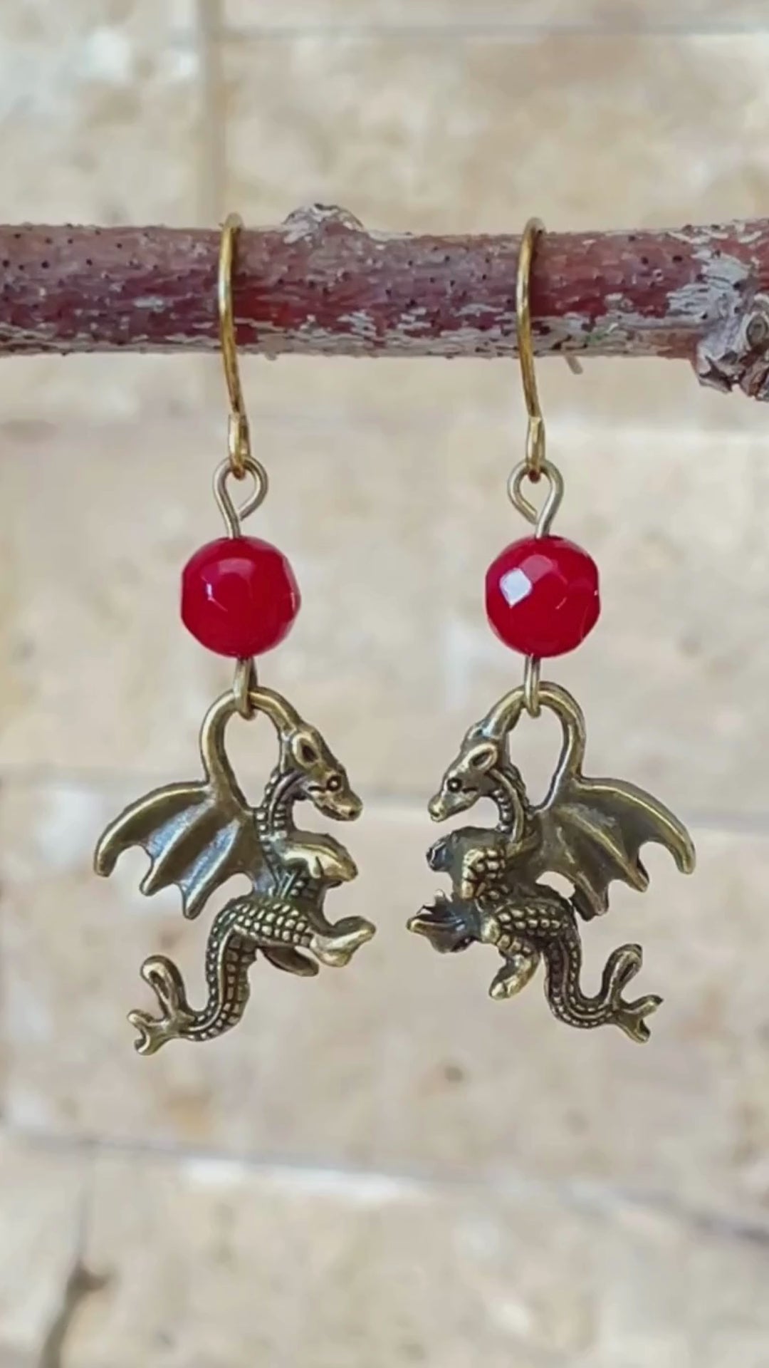 Red Jade Dragon Earrings – Antique Bronze Dragon Charms, Fantasy Jewelry, D&D Accessories, RPG Earrings