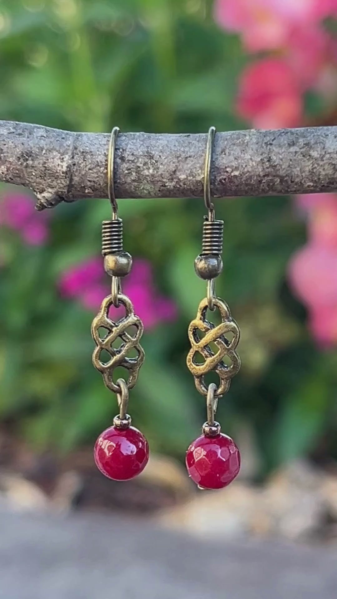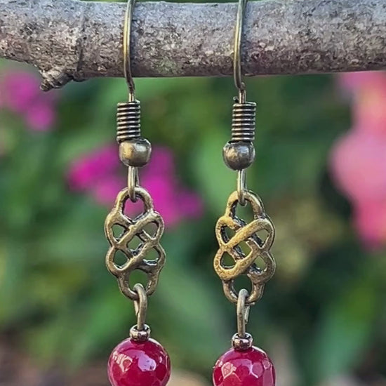 Embrace timeless symbolism with these stunning antique bronze/gold Celtic knot earrings featuring vibrant red jade faceted beads. Designed for lovers of Celtic jewelry, boho dangle earrings, and symbolic pagan accessories, this pair blends bold color with ancient artistry.