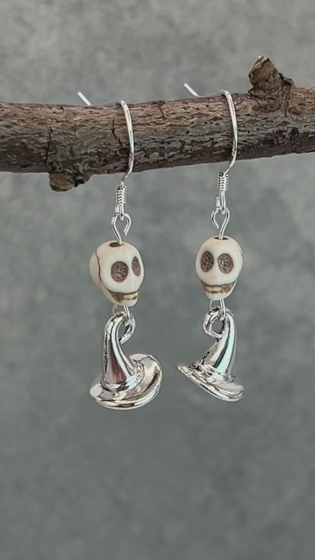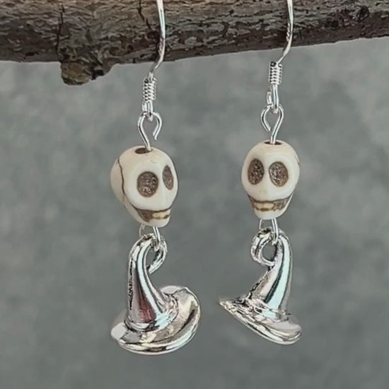 Turquoise Skull Earrings with Silver Wizard Hat – Fantasy Jewelry, D&D Accessories, RPG Earrings, Wizardcore Jewelry, Handmade Gift for Fantasy Fans